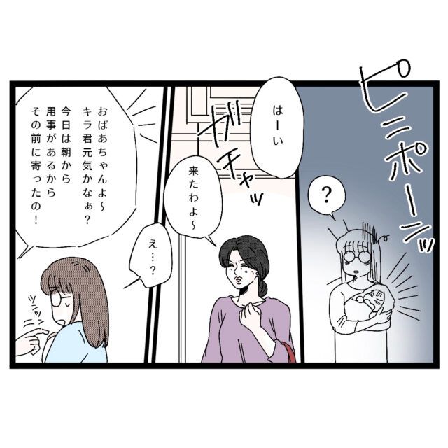 すると「ピンポーンッ」「?」誰かと思っていると「来たわよ~」といつものように家に入ってくる実母、「え・・?」とアサ子さんが驚いていると、「おばあちゃんよ~キラくん元気かなぁ?今日は朝から用事があるからその前に寄ったの」と言いました。