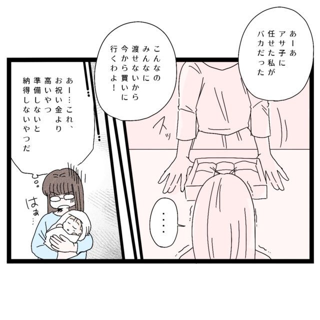 出産のお祝い金を預かっておきながら「代わりに買ってきてあげたのよ!」と買い物を楽しんできた実母、その上「ちゃんとお返しは準備しなさいよ。私が配っておくから!」あまりに理不尽な話に「え・・お祝い金全部使って、自由に買い物楽しんで、お返しは私が準備!?」と思ったものの、3年ほど前の記憶がよみがえったアサ子さん、お返しの品が気に入らず、「これが半返し!?」「安っぽいのイヤなんだけど!」「アサ子に任せた私がバカだった」と散々な言われようだったことを思い出し「これ、お祝い金より高いやつ準備しないと納得しないやつだ」という結論に至りました。後日、お祝い金より高いお返しを用意して実母に渡したところ「ふぅん、いいんじゃない」と満足そうな実母の顔を見てホッとするアサ子さん、「お金がかかるけど、文句をずーーーっと聞かされるより全然マシ・・ほんと見栄っ張り!」とまたまた呆れました。
