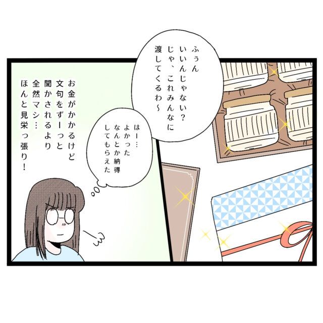 そして、選びに選んだお返しを用意して実母に渡したところ「ふぅん、いいんじゃない?じゃ、これみんなに渡してくるわ~」満足気な実母のことばを聞いて「はー・・よかった。なんとか納得してもらえた」と安心するアサ子さん、「お金はかかるけど、文句をずーーーっと聞かされるより全然マシ・・ほんと見栄っ張り!」と心の中で思いました。