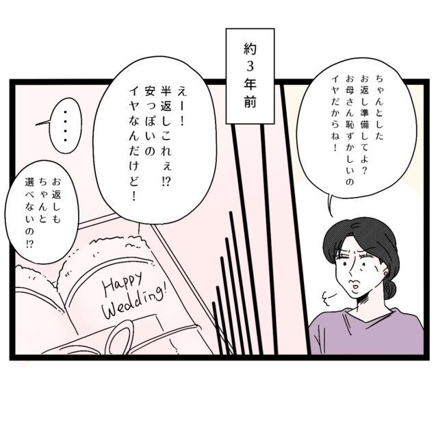 突然やって来たかと思ったら「そうそうコレ!」とたくさんの洋服を差し出した実母、「ヨシコさんとヒダさんとこからお祝い金を貰ったから代わりに買ってきてあげたのよ!私が配っておくからお返しは準備しなさいよ~」という言葉に「え・・お祝い金全部使って、自由に買い物楽しんで、お返しは私が準備!?」実母の意味不明な言葉にモヤモヤが止まらないアサ子さん、でもそういえば3年ほど前のこと、「ちゃんとしたお返し準備してよ?お母さん恥ずかしいのイヤだからね!」「えー!半返しコレ!?安っぽいのイヤなんだけど!お返しもちゃんと選べないの!?」「・・・」実母に言いたい放題言われた記憶がよみがえってきました。