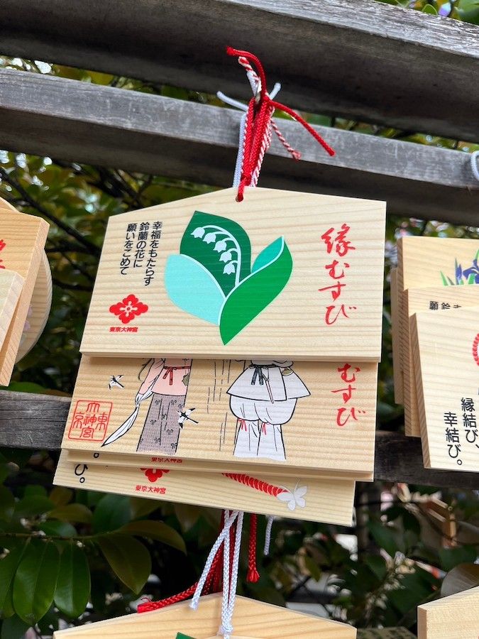 本殿でしっかり参拝をしてから、絵馬をかきにいきます! お友達は絵馬に恋愛のお願いをかいていました。私は絵馬に「これからたくさんのご縁がありますように」と、日々の全体的なご縁をお祈りしてみました! 絵馬のデザインがいくつかあり、かわいい鈴蘭の絵馬にしました♡ 7月末現在。たくさんの方と出会い、さまざまなご縁を感じています。絵馬が神様によく見えるように1番上の真ん中にかけました。