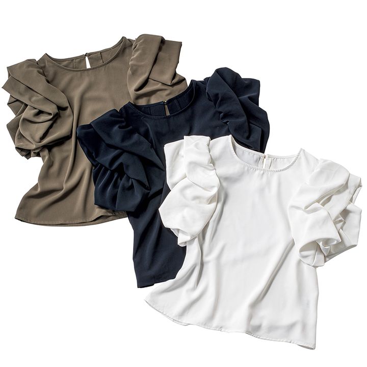 MEISM by Re:EDIT フリルパフスリーブブラウス カーキ、ネイビー、ホワイト Price_¥5,599