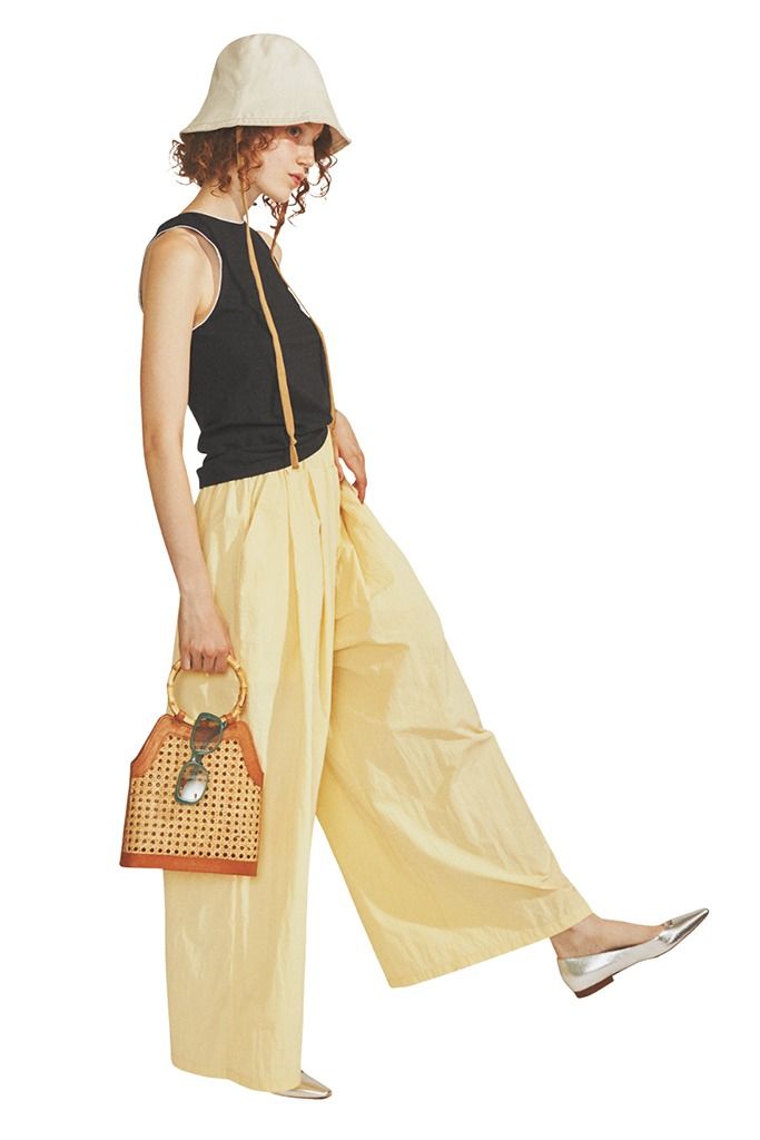シルバーフラットシューズ(1.5)/ペリーコ(アマン) イエローナイロンワイドパンツ/AKTE タンクトップ/onit(ヤギ) ハット/OVERRIDE(OVERRIDE 神宮前店) バッグ/バリ・ワークスタット(ショールーム ロイト) サングラス/レイバン(ルックスオティカジャパン カスタマーサービス)