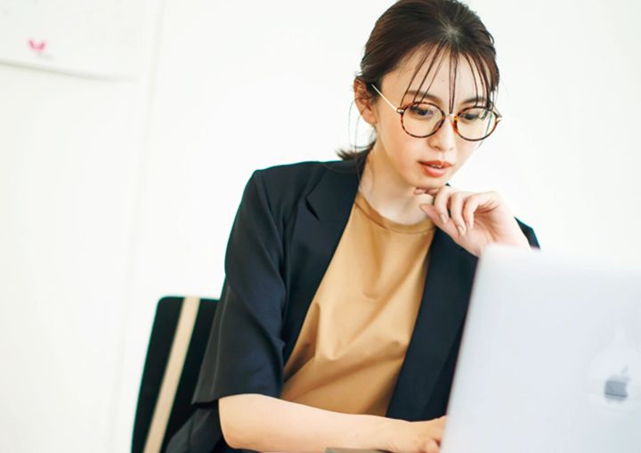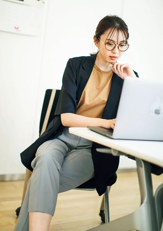 半袖ジャケットと美脚パンツでキリリとした印象に。モノトーンの差し色にはキャメルカットソーとべっ甲フレームのメガネを抜擢!ベーシックカラーでまとめて落ち着きのあるコーデに。