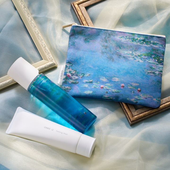 さらに『SKINCARE LOUNGE BY ORBIS』店舗限定で、名画デザインの『CREATE BOTTLE』、または「Maison de muse」のグッズを購入したうえ、オルビス商品を 3,500 円(税込)以上購入すると、先着順でノベルティとしてクロード・モネ「睡蓮」のオリジナルデザインポーチがもらえるそうです。