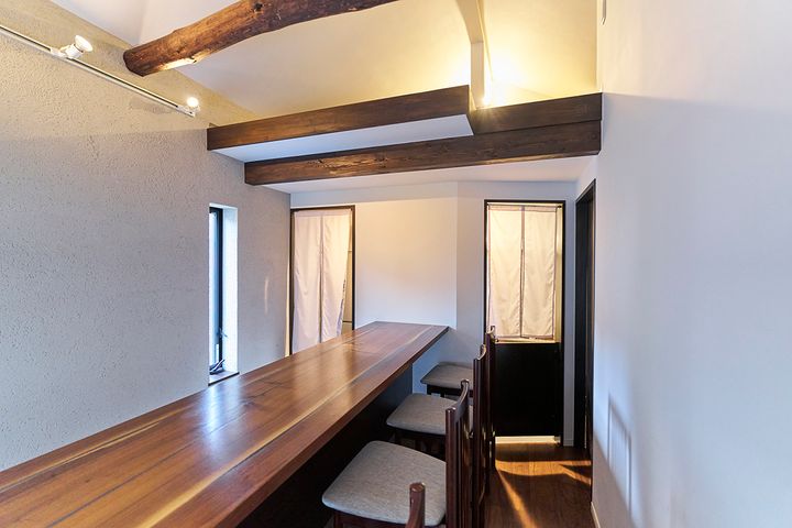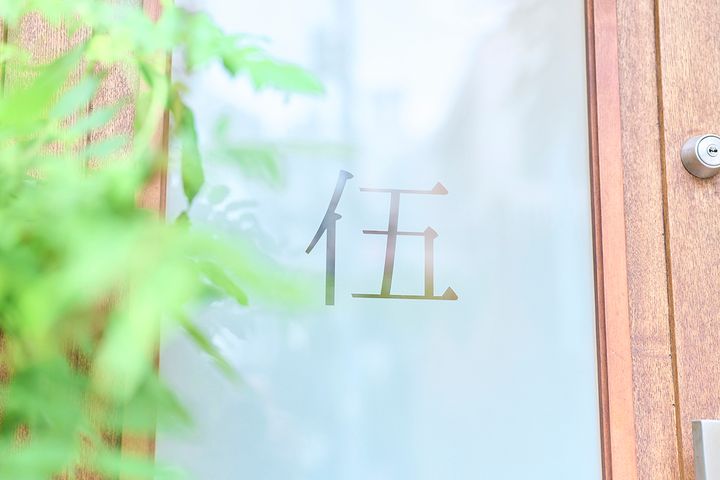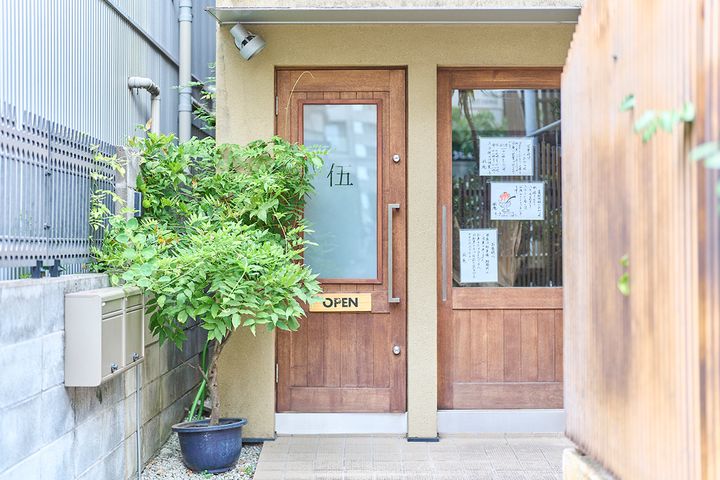 店名は、「いつ」と読みます。伍は五の意味で、「五感を研ぎ澄ませる場所」という思いが込められているそう。入り口の扉を開けるとすぐに玄関があります。ここで靴を脱いでから、階段を上がり店内へ。