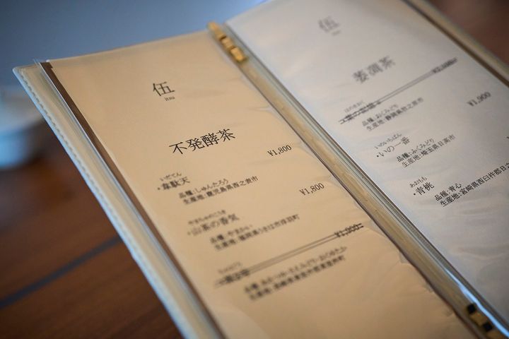 「伍」のお茶は、不発酵茶、萎凋茶、和紅茶、玉露、抹茶のカテゴリー別に、季節の旬を感じられるものを店主がセレクト。そこからどんな風味が希望かなどを店主に相談し、オーダーします。