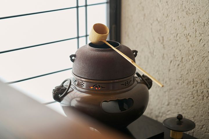 静かにお茶を飲んでいると、シュワシュワという音が。こちらの「風炉(ふろ)」でお湯を沸かしている音です。普段ならあまり聞き取れない繊細な音を敏感に感じ取りながら、お茶を飲みます。