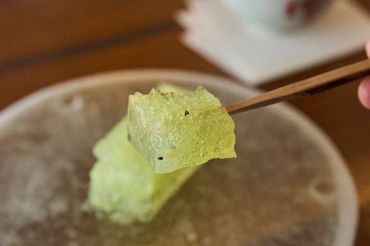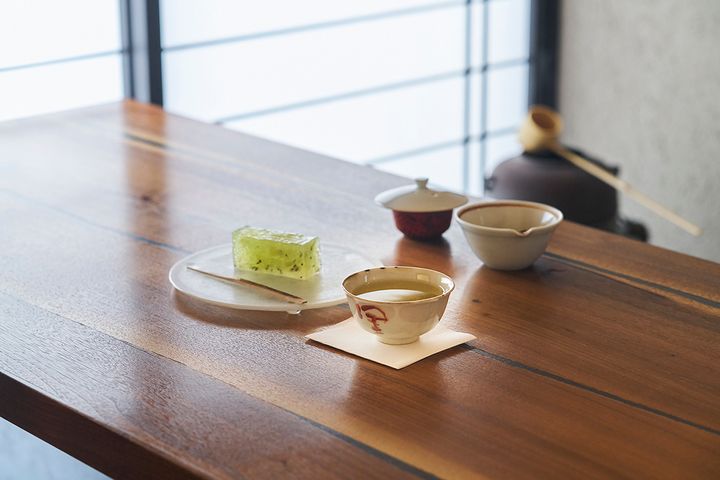お茶受けの和菓子は、季節に合わせたもの。取材時には暑い日にぴったりの、シュワっとした口あたりのキウイを使ったソーダ寒天でした。冬にはサツマイモのぜんざいなどがラインアップするそうです。