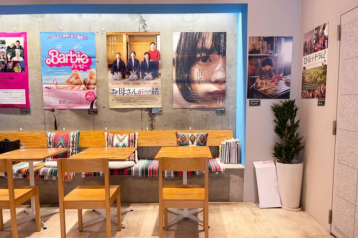 店内は、ブルーがアクセントのおしゃれな空間で、壁一面に映画のポスターが飾られています。上映中のものから、これから上映するものまでさまざまな作品がずらっと並んでいて、ワクワクが止まりません。