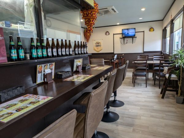 中に入ると、大きなインドの国旗や飾り物が沢山あって、気分は一気にインドモード。コーナーになったカウンター席は10席ほど、テーブル席も10席くらいと広めの店内です。