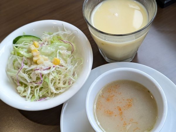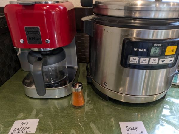 タイトルにもメニュー表にも書いてありますが、なんとこちらのお店は全てのカレーセットに「ドリンクバー」と「スープバー」が付いているんです!ドリンクは冷水の他、アイスコーヒー・ホットコーヒー・ウーロン茶・ラッシー・マンゴージュースという5種類のラインナップ!