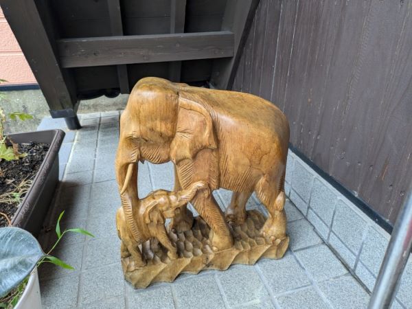 入り口には両側に象さんが鎮座。木彫りの象さん親子がお出迎えしてくれますよ。