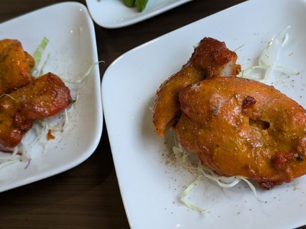 こちらはディナーセットの「チキンティッカ」です。土釜で焼いていて、ちょっと炭火の香りがしたチキンは、香ばしくってジューシーでおいしすぎます。プラス200円とは思えないほど、大きくて食べ応えもありますよ。