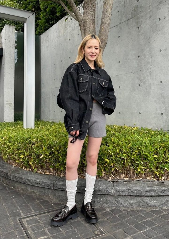 「ノンウォッシュのデニムシャツはかたい印象に見えがちですが、ミニ丈のニットショーツを合わせることで大人のフェミニンさを意識しました。ラフな着こなしにならないよう、ボリューム感のあるローファー×ハイソックスでトラッドなムードに落とし込んだところもポイントです」