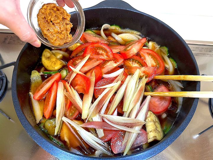 6. 3のトマトとみょうが、みそを加えて、まんべんなく火が通るまで煮る。