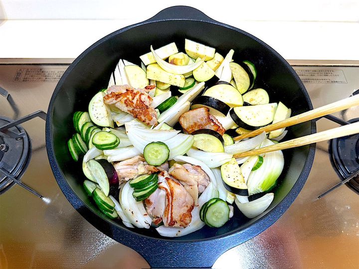 4. フライパンで1の鶏肉を炒め、肉の色が変わったら3の玉ねぎ、きゅうり、水気を切った2のなすを加え、さらに炒める。