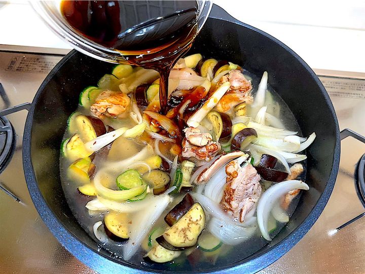 5. 野菜がしんなりしたら、めんつゆ、水を加えて肉に火が通るまで煮る。