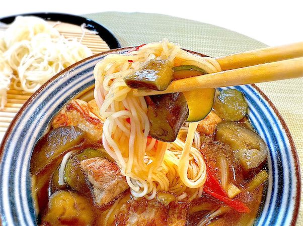 煮込まれて甘くなった玉ねぎ、とろっとした食感のなすとトマトは口の中でとろけて、つるんとしたそうめんと相性抜群♡