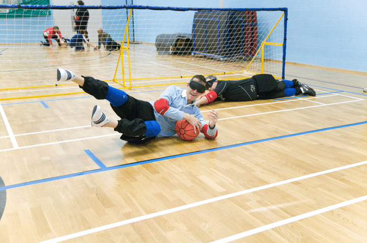 ゴールボールは、視覚に障がいのある人のために考案されたスポーツ。1チーム3人の選手が、鈴の入ったボールを転がすように投げ合って、相手ゴールにボールを入れて得点を競い合う球技。サッカーと同じようにゴールボールのゴールにもネットが張られているけど、その幅はサッカーより大きく9m、そして高さはサッカーより低く1.3m。そのため、守備では目いっぱい腕を広げたり、足を伸ばしたりして全身を使ってゴールを阻止する。