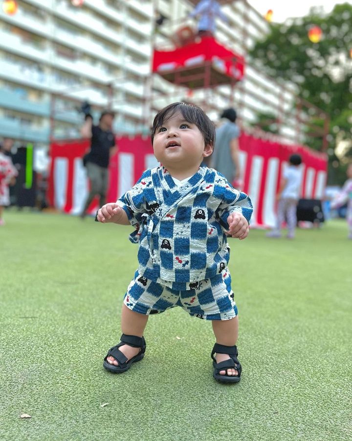夏祭りの会場で突然立ち上がり、ひとりで立っちができるようになったそう。
