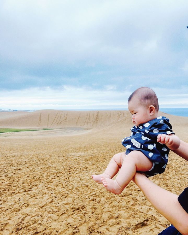 初めての鳥取砂丘。不思議そうに地面を見ているのは生後4カ月の赤ちゃんです。