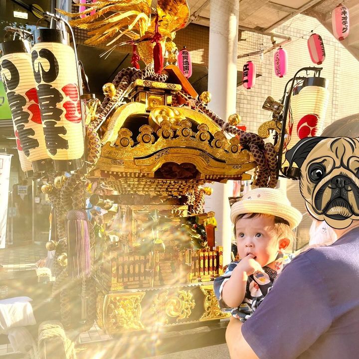 お神輿の近くでびっくりしているような表情の男の子。