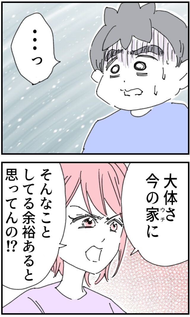 「育休中の人間に仕事押し付けてる時点で終わってるっつーの!!」かおりさんの言葉に「・・・っ」顔面蒼白になるいちろうさん、すると「大体さ、今の家に、そんなことしてる余裕あると思ってんの!?」とかおりさんが切り出しました。