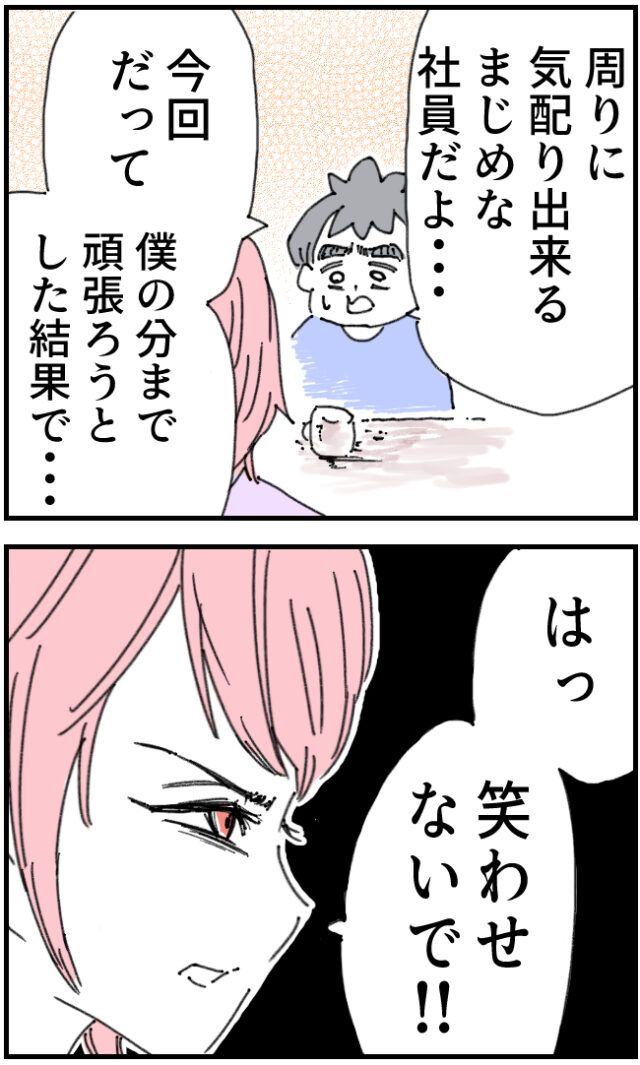 「周りに気配りできるまじめな社員だよ・・今回だって、僕の分までがんばろうとした結果で・・」いちろうさんがそう言うと、「はっ!笑わせないで!!」と一喝するかおりさん。