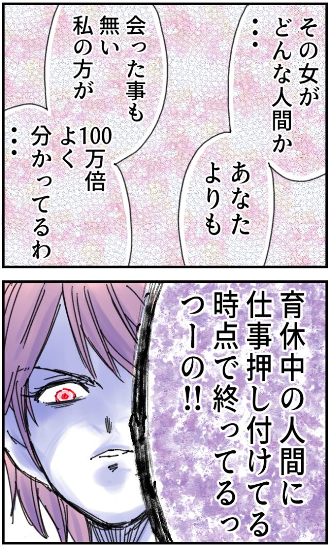 「その女がどんな人間か・・あなたよりも、会ったことがない私の方が100万倍よくわかってるわ・・」そう言うと、「育休中の人間に仕事押し付けてる時点で終わってるっつーの!!」恐ろしい形相でいちろうさんを睨みつけました。