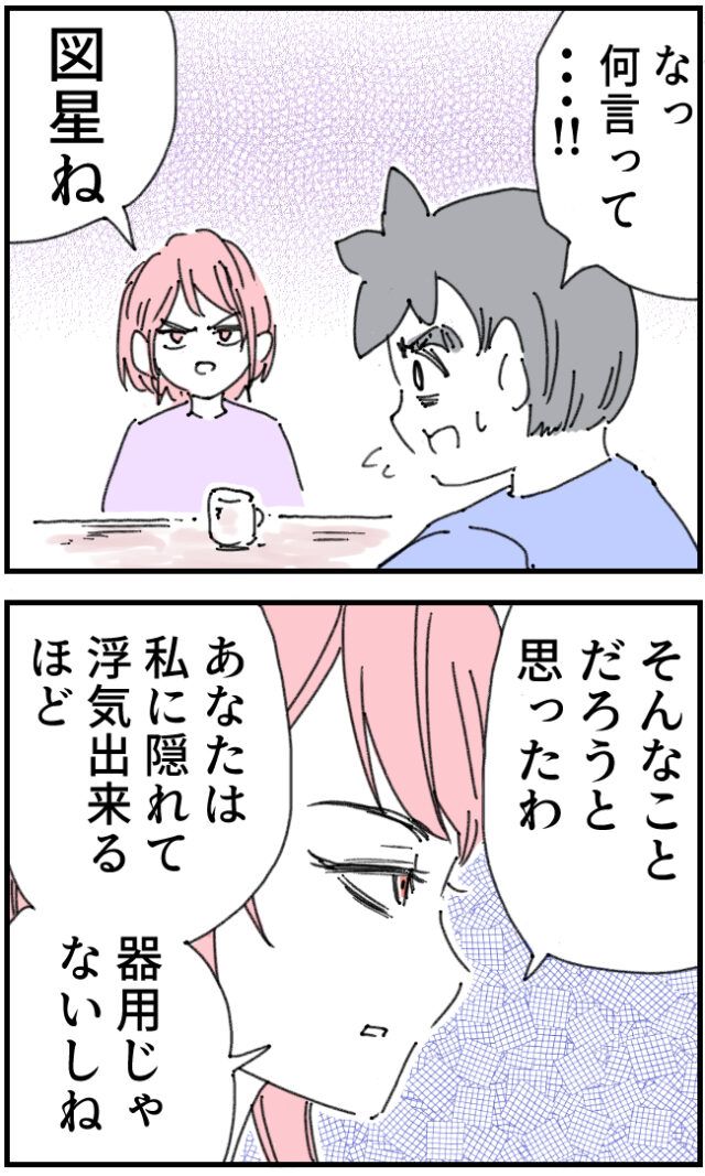「その女にまんまと仕事押し付けられて、家族を蔑ろにしてるってことね」かおりさんにそう言われ言葉に詰まるいちろうさん、「なっ何言って・・!!」と驚くも「図星ね」とズバリ。「そんなことだろうと思ったわ。あなたは私に隠れて浮気できるほど器用じゃないしね」そう語るかおりさん。