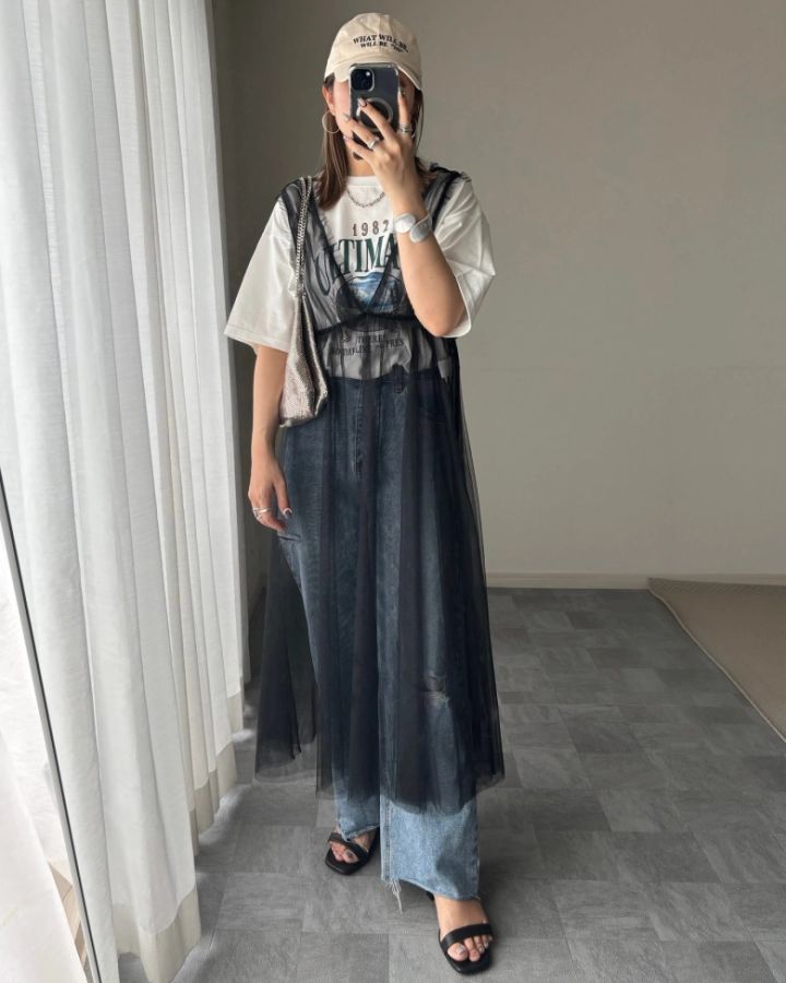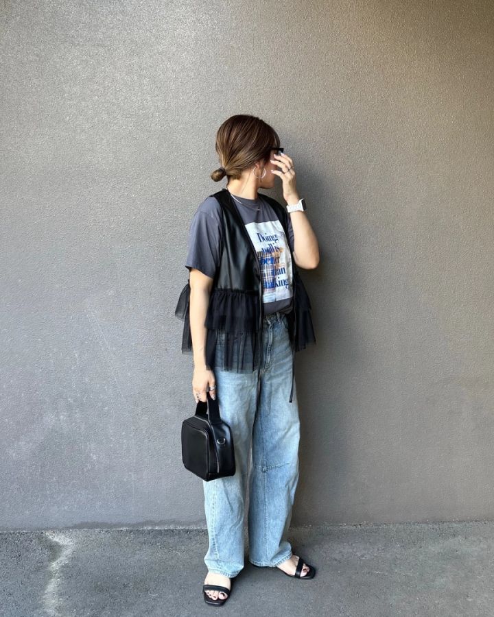 こちらのフォトTシャツは、普段モノトーンコーデが多いという方にもおすすめの1枚。主張しすぎないカラーフォトがアクセントになり、Tシャツ+パンツのシンプルなコーデでもこなれ感を演出できます。チュールのベストやキャミソールをオンすると、一気にレディー感がプラスされるのでお試しあれ♡