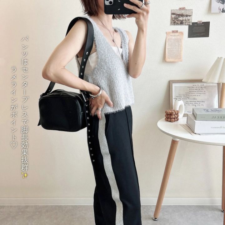 最後に紹介するのは、サイドのラメラインがポイントのパンツです。ラインだけでなくセンタープレスも入っているため、脚長効果ばっちり!ショートベストでヘルシーに決めたり、テーラードジャケットをオンしてIラインを作ったりもできます。メタリックカラーはこの秋も人気継続。トレンド感もアップできますよ。