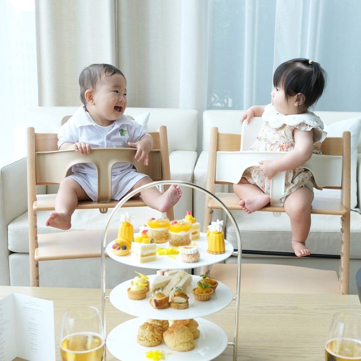 ママたちのアフタヌーンティーに同席している2人の赤ちゃん。