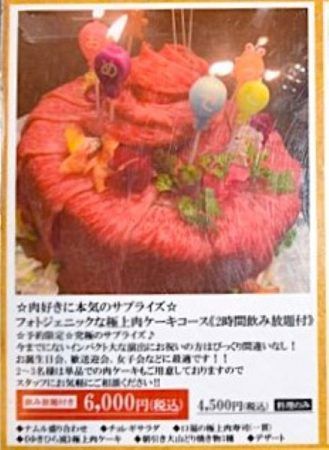 宴会メニューの中に「フォトジェニックな極上肉ケーキコース」がありました。 ゆきひらでは「大山どり」以外のお肉も提供されています。 このお肉のケーキは、なかなかのインパクトですね!「☆肉好きに本気のサプライズ☆」と書いてあります。 このお肉ケーキが登場すればお肉好きの人はもちろん、そうでない人も盛り上がりそうですよね!!(詳しくはお店のホームページ、またはお店にお問い合わせください。)