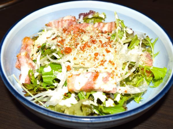 「カリカリベーコンと半熟卵のシーザーサラダ」(858円) 焼きベーコンの香り漂うシーザーサラダは本当に美味!とメニューをに書いてありました。