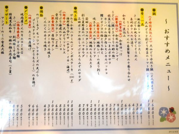 大山どり以外のメニューも一部ご紹介します。 こちらの「おすすめメニュー」は従業員の方が意見を出し合い、試行錯誤され2週間ごとに見直され変わるとのことです。 人気メニューはそのままありますが、残念ながら消えていく、幻のメニューもあるとのことです。 「おすすめメニュー」もぜひチェックしてみてくださいね♪