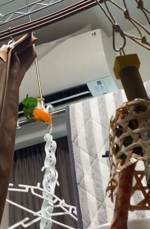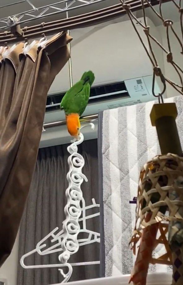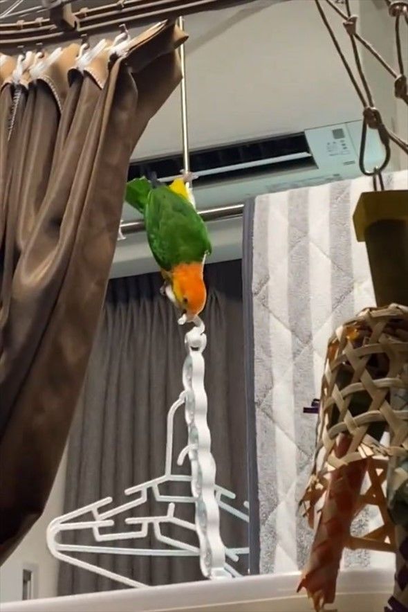 器用なうえに力持ち!インコがハンガーを落とそうとしてると思ったら・・、かけ直した!?
