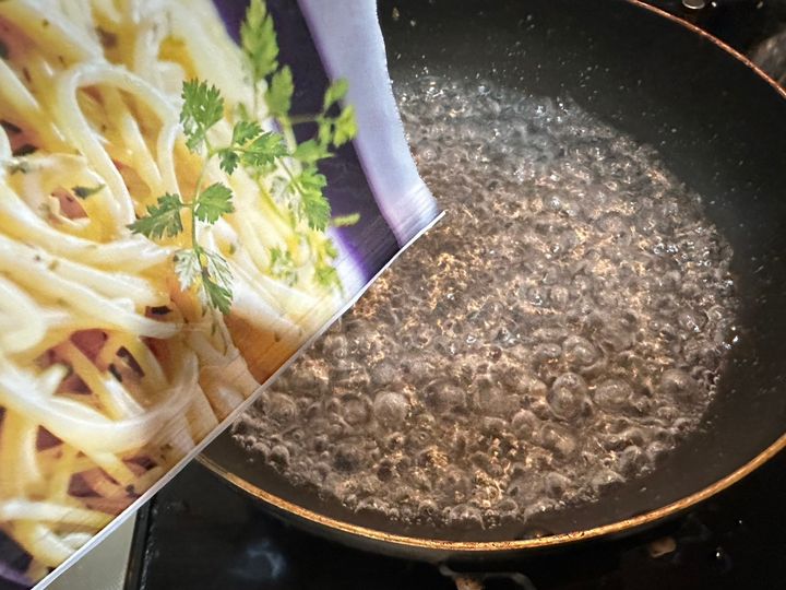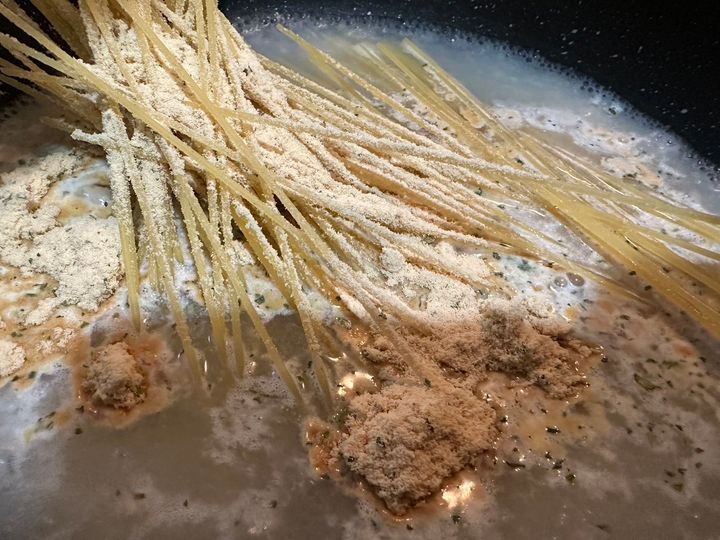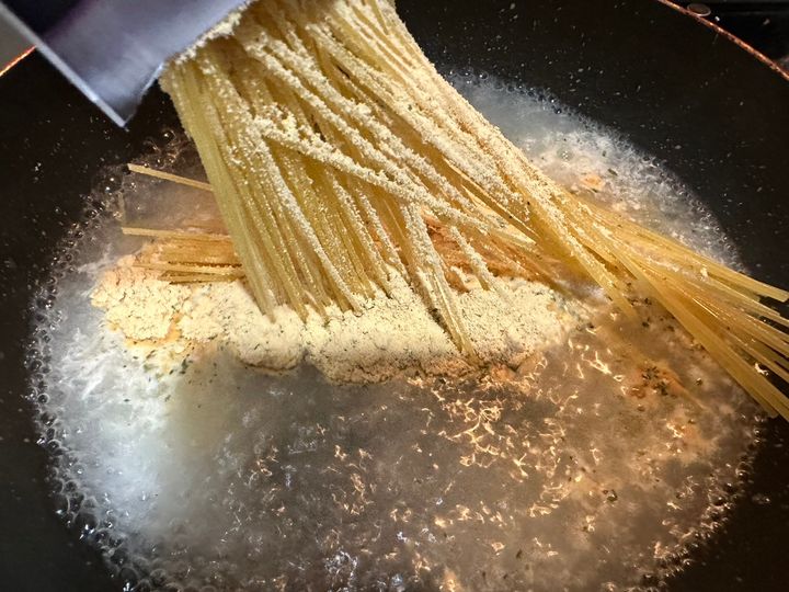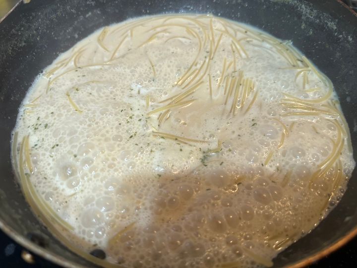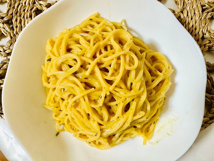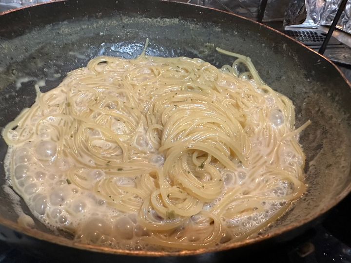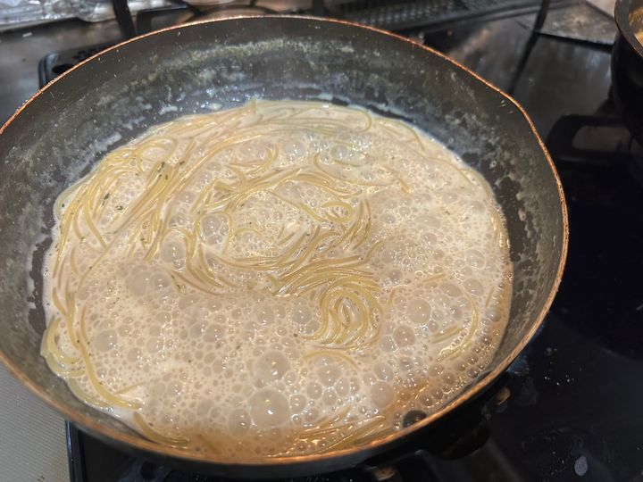 たまにフライパンを揺すったのみで、もうこんなパスタができてしまいました。。