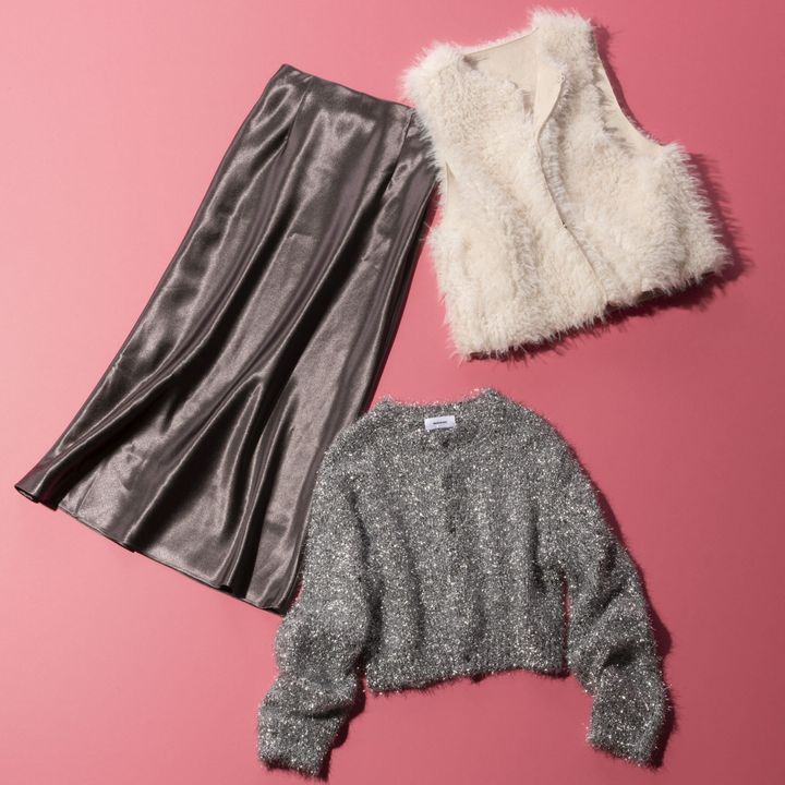 (写真右下)C 華やかなラメニットはカーディガンタイプを選べば肩がけしても映える。¥19,800(ミースロエ)