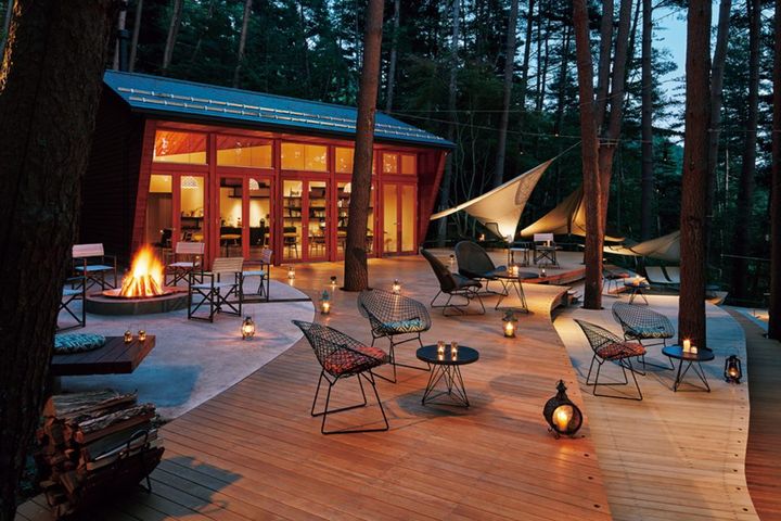 自然を間近に感じられるキャビンは1/3がテラスリビングソファ、焚き火を楽しめるファイアスペースもあり。ジビエが楽しめる、山の幸にフレンチのエッセンスを加えたコース料理も魅力です。