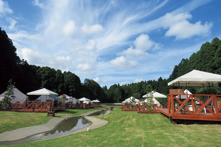 キャンプ初心者でも安心して満喫できると大人気のキャンプ場。グランピング、テント泊(手ぶらでキャンププランもあり)、コテージでの宿泊が可能。サイト内にある、天然温泉「かりんの湯」はこの春リニューアル。収穫体験で獲った季節の野菜はそのままBBQにも!
