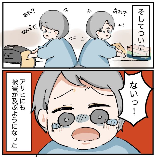 そしてついに、「あれ?ん?どうして?なんで?」ある日、何かを探していたアサヒくん、「ないっ!!」涙ながらに訴えました。それを見て、「とうとうアサヒにも被害が及ぶようになってしまった」ママはそう思いました。