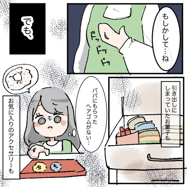 「もしかして・・ね」と考えるママ、「でも、引き出しにしまっていたお菓子も、パパにもらったヘアゴムもない、そしてお気に入りのアクセサリーも」と家の中にあったはずのものがどんどんなくなっている事実から、どうしても疑念を晴らすことができません。