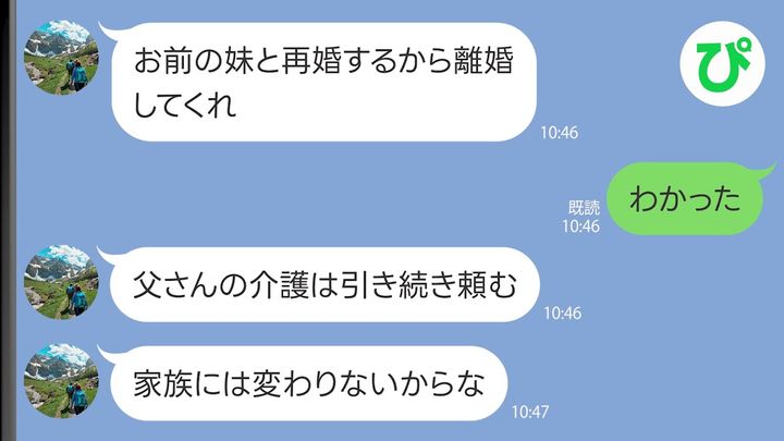 妹は義父が押しかけ、介護をするよう迫ったせいで、パニックになっていると言います。助けてやってほしいと夫に言われましたが、人の夫を寝取るような妹ですからもう家族とも思えませんし、協力する義理もありません。別れた妻に気安くお願いをしてくる夫にも呆れます。