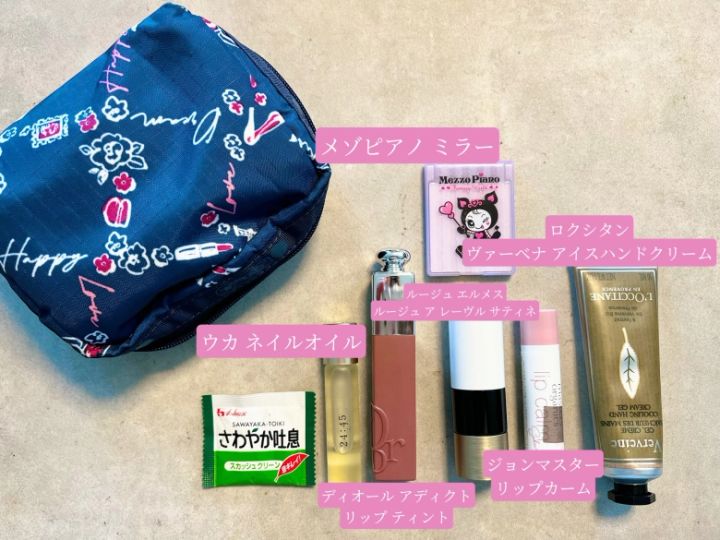 小さなポーチには頻繁によく使うアイテムを収納しています。リップやハンドクリームは1日のうちに何度も使うので、こうやって他の美容アイテムとは分けて持っているんです♡小さいミラーはガチャガチャでゲット(笑)。