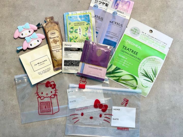 たいていのサンプルは薄いので、フェイスマスクも一緒にジップロックにまとめて持ちます。おすすめは紀ノ国屋で発売されているキティちゃんコラボのジップロック♡こちらは絵柄ももちろん可愛いのですが、大きさが3種類入っていて用途に合わせて使えるのでオススメ♡ マチ付なので小さく見えて大容量なところと、スライド式なので開け閉めしやすく液漏れが防げるのも愛用している理由のひとつです。