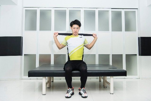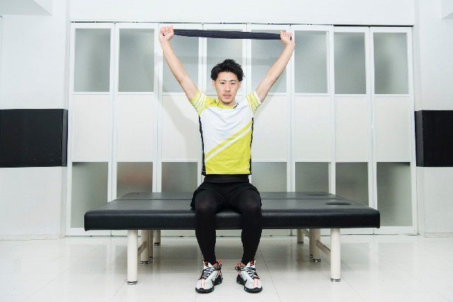(1)椅子に背筋を伸ばして座って、タオルを両手で持ち頭の上に持ち上げる