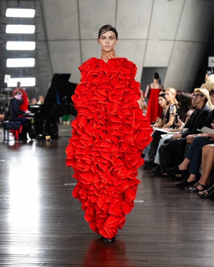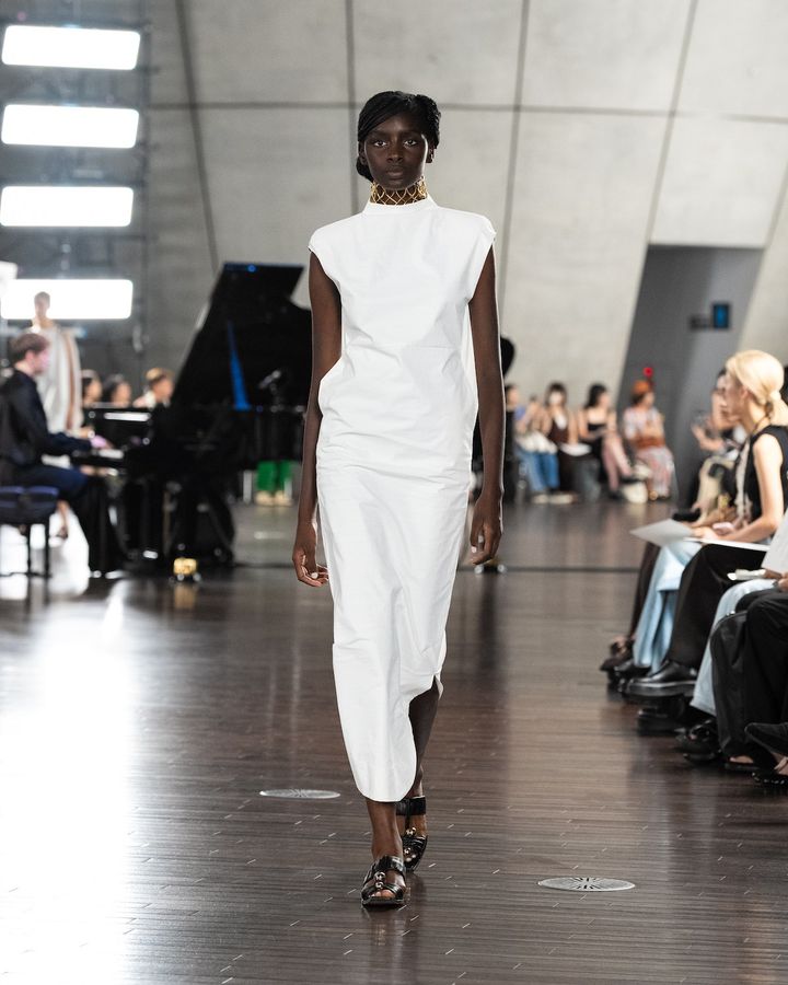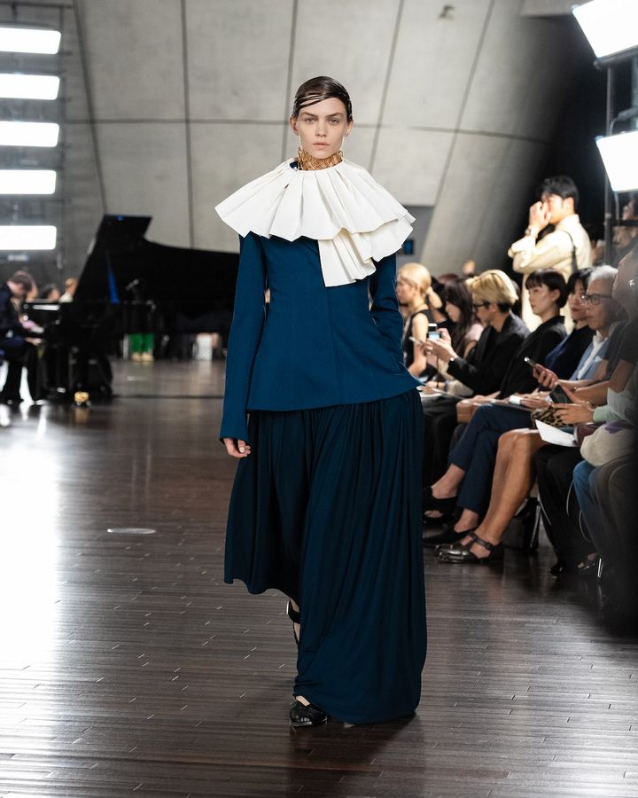 9月2日にスタートするRakuten Fashion Week TOKYOに先駆け、8月27日夜、ハルノブムラタHARUNOBUMURATA)が2025年春夏のショーを行った。会場となった国立新美術館のスケジュールの都合によりファッション・ウィークに参加しなかったというが、そこまでして美術館にこだわったのは、いつものように席に置いてあったリリースに記載されていたように、今季コンスタンティン・ブランクーシの思想と美学が着想源となったから。デザイナーの村田晴信は、どうやら今年の3月から7月まで開催されていた、アフリカ彫刻の要素を取り入れた独自のスタイルで有名な彫刻家の日本初の本格的な個展を観たようだ。ショーの終了後、「彫刻が展示室から出てきてそのまま歩いているような感じになったらすごく素敵だなと思った」と語った。