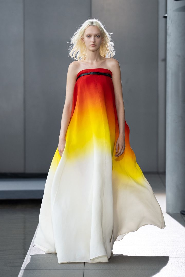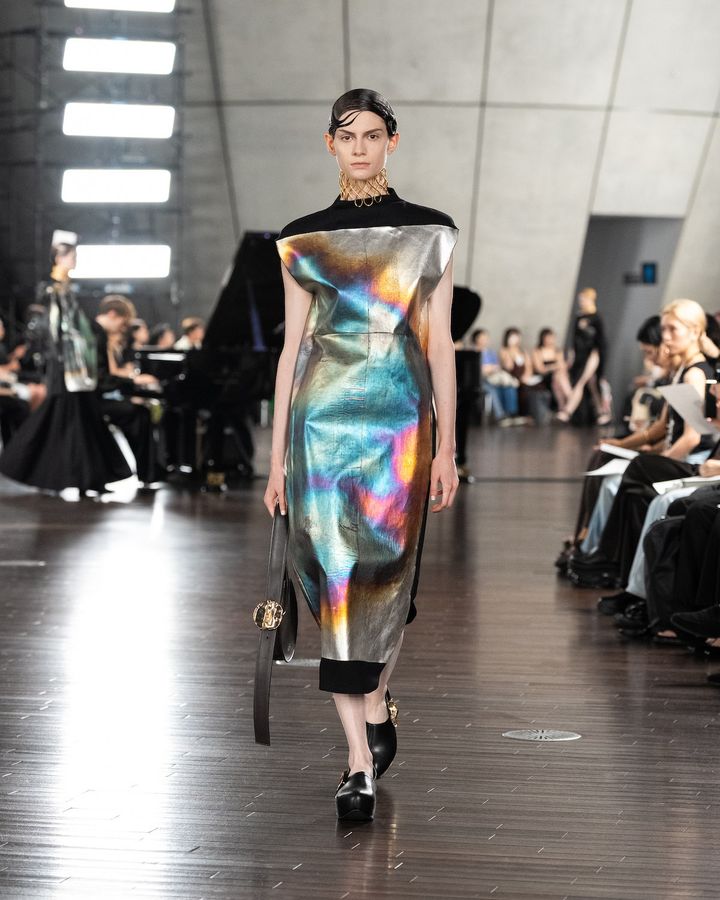 柔らかな布の流れをドレープとして固定する、ということや、無地のルックが続く中で一際目を引いたグラデーションのアイテムもそれに関連する。金糸を織り込んだ西陣織「引箔」で名高い西村商店の工房の協力を得て、銀が硫化して変色する性質を利用した「焼箔」の技術を用いているが、それは「雨にさらされて色が変化していく彫刻のように、時間の流れをドレスの中に閉じ込めることができないか」と考えたから。